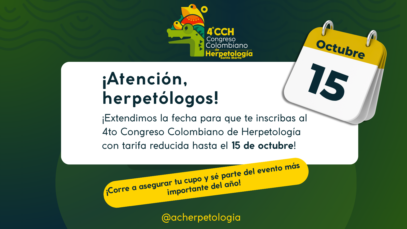 SITIO WEB DEL 4CCH Descubre todos los detalles del 4° Congreso Colombiano de HerpetologíaHaz clic aquí y entérate de la programación, ponentes, actividades y cómo